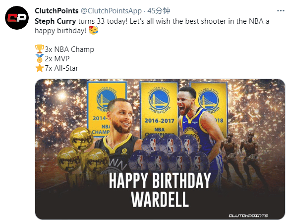 美媒ClutchPoints也祝库里33岁生日快乐,图片中的wardell是库里的真名,全名叫沃德尔-斯蒂芬-库里二世(WardellStephen Curry II)