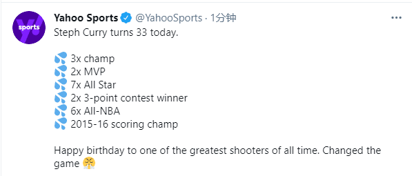 Yahoo Sports更新社交媒体,列为库里六大荣誉——3次总冠军、2次MVP、7次全明星、2次三分冠军、6次最佳阵容和15-16赛季得分王;恭喜史上最伟大的射手33岁生日快乐,他改变了比赛。