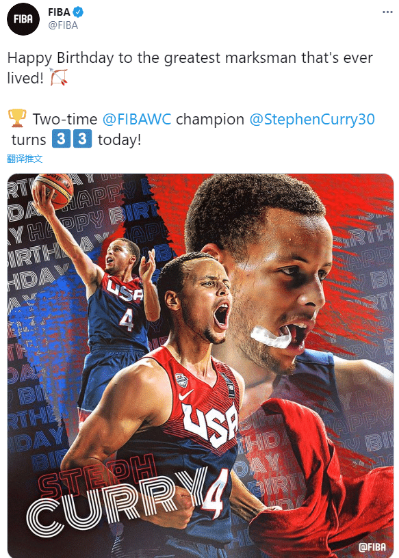 FIBA(国际篮联)官方晒出库里身披美国队4号球衣的照片,发推写道:祝有史以来最伟大的神射手生日快乐!两届FIBA冠军今天33岁了。