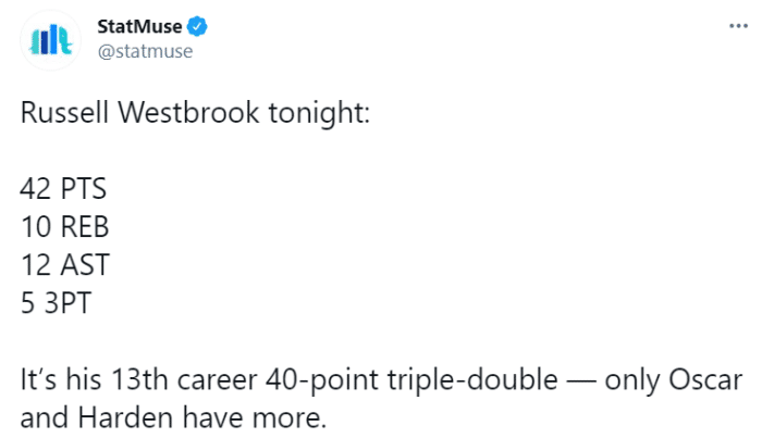 据美媒statmuse统计,这是韦少生涯第13次砍下40分的三双!在NBA历史上仅次于大O罗伯特森和哈登!