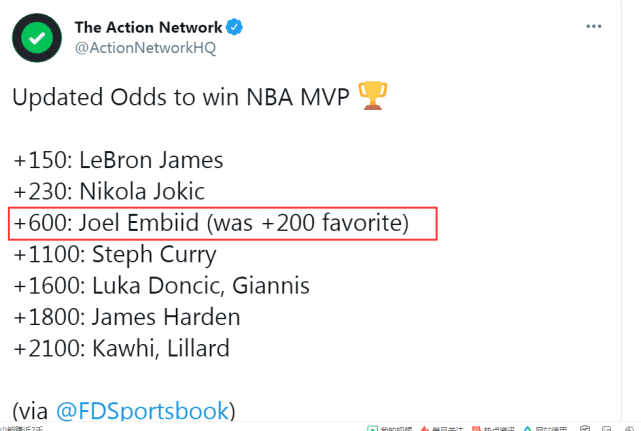 最新MVP赔率出炉!詹姆斯重回榜首,恩比德受伤跌至第3哈登仅第7