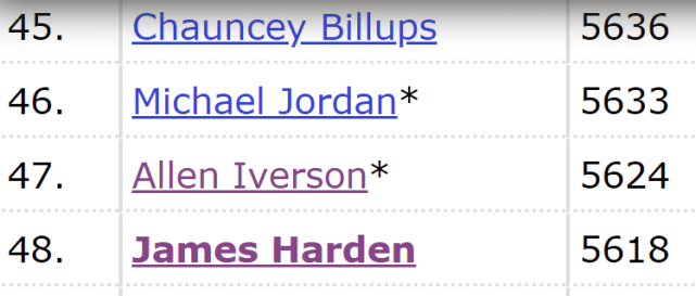 除了生涯总得分,哈登的生涯总助攻也有望在下一场比赛迎来新的里程碑。数据显示,哈登生涯总助攻数达到5618次,目前排名历史第48位,距离前一位的艾弗森(5624次)只差6次。下一场比赛,只要哈登再送出7次助攻,就能超越艾弗森,升至历史第47位。在历史助攻榜上,哈登距离乔丹(5633次)和比卢普斯(5636次)也不远了。