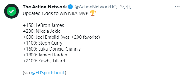 36岁詹姆斯力压两大中锋又重回第一领跑MVP赔率榜,仍旧是博彩公司最看好的MVP热火;而恩比德受伤后排名下跌,此前恩比德的伤情确诊为骨挫伤,十字韧带和半月板都完好无损,预计伤停2-3周,因此MVP赔率又发生不小的变化。