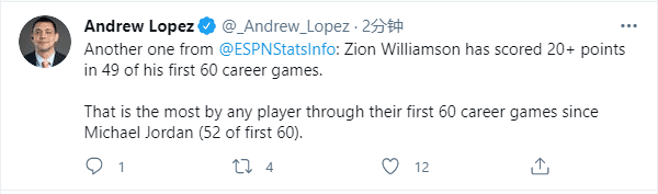 第三、锡安生涯前60场已经49次单场20+,成乔丹之后第一人,此前乔丹曾在生涯前60场有52场轰下20+。