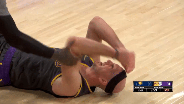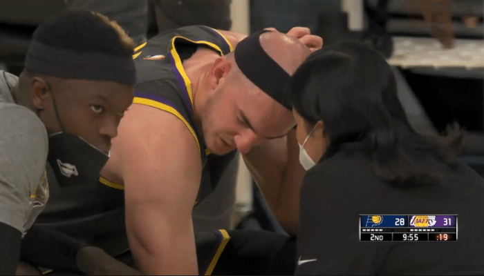 湖人又伤一人!卡鲁索脑袋砸地返回更衣室,谁留意到詹皇反应?示意先别打了