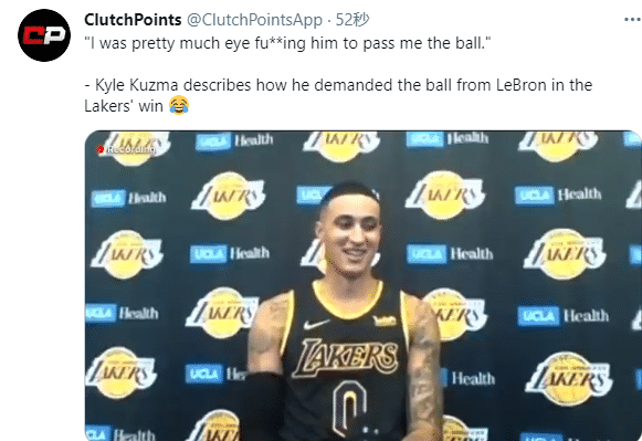 再谈到和詹姆斯互瞪的时候,库兹马表示,我和詹姆斯一直相互着看着对方,詹姆斯在观察我的位置,而我一直瞪着詹姆斯是想让他赶紧把球传给我。然后,詹姆斯找到了我,他创造了机会,而我也把球投进了。在说到这一幕的时候,库兹马又像在选秀大会上那样憋不住笑了起来。