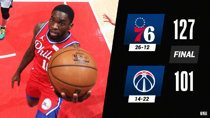 76人(26-12):恩比德23分7板3助2帽、丹尼-格林12分6板4助2断、哈里斯14分8板3助、米尔顿18分4助2断、科克马兹18分3板3助
