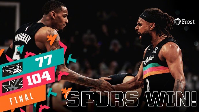 北京时间3月13日讯 NBA常规赛,魔术做客圣安东尼奥挑战马刺,前者近期遭遇6连败已经掉落至东部倒数第二位,后者也是2连败滑落至西部第七位,双方都急需一场胜利,本场比赛德罗赞缺阵,魔术多名主力球员因伤也打不了。开局阶段,魔术就打出10-2开局一举建立优势,马刺没有状态连续打铁且末段再次陷入得分荒,魔术带领13分的优势进入次节,次节马刺提升防守强度让魔术半节只得到2分,进攻端也打出10-0攻击波将比分扳平,后半段马刺持续发力反超8分进入下半场。易边再战,马刺打出6-0小高潮扩大分差,魔术众将连续4个三分将分差迅速缩小,马刺瓦塞尔也连中三分稳住局势,三节结束马刺依然领先10分。末节上来盖伊率领马刺再打出9-0,随后马刺全面开花将分差扩大至20分以上,魔术无力抵抗,最终马刺大胜魔术,送给对手7连败。最终比分马刺104-77魔术。