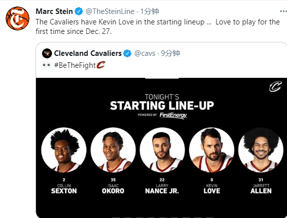 来源:24直播网03-13 09:4924直播网3月13日讯 骑士球星凯文-乐福终于伤愈复出,骑士已经官宣首发阵容,乐福搭配塞克斯顿、奥科罗、小南斯和艾伦一起首发出战,不过乐福将会有出场时间限制,毕竟他已经两个半月没有打过比赛,伤愈归来的第一场比赛,确实不能打太久。