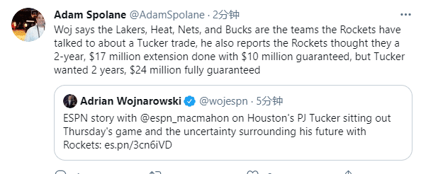 塔克也效仿哈登逼宫火箭吗?目前塔克不在火箭伤病名单上,直接缺席了火箭和国王的比赛,也许这就是火箭交易塔克的积极信号;据ESPN名记报道,最近几周,雄鹿、湖人、热火和篮网都和火箭讨论了交易塔克,这四支球队都可能是他的潜在下家,但貌似火箭和他们的谈判并不顺利,要不然塔克也不会对火箭的操作感到失望。