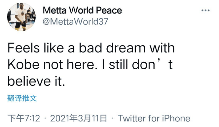 阿泰斯特和科比的缘分是很多人都知道的,两人从对手变成队友,关系也一直都很好,科比是在去年年初离世的,后期新冠来袭,冲淡了不少对于科比的思绪,所以阿泰斯特才说一直到现在自己都不愿意接受这件事情。