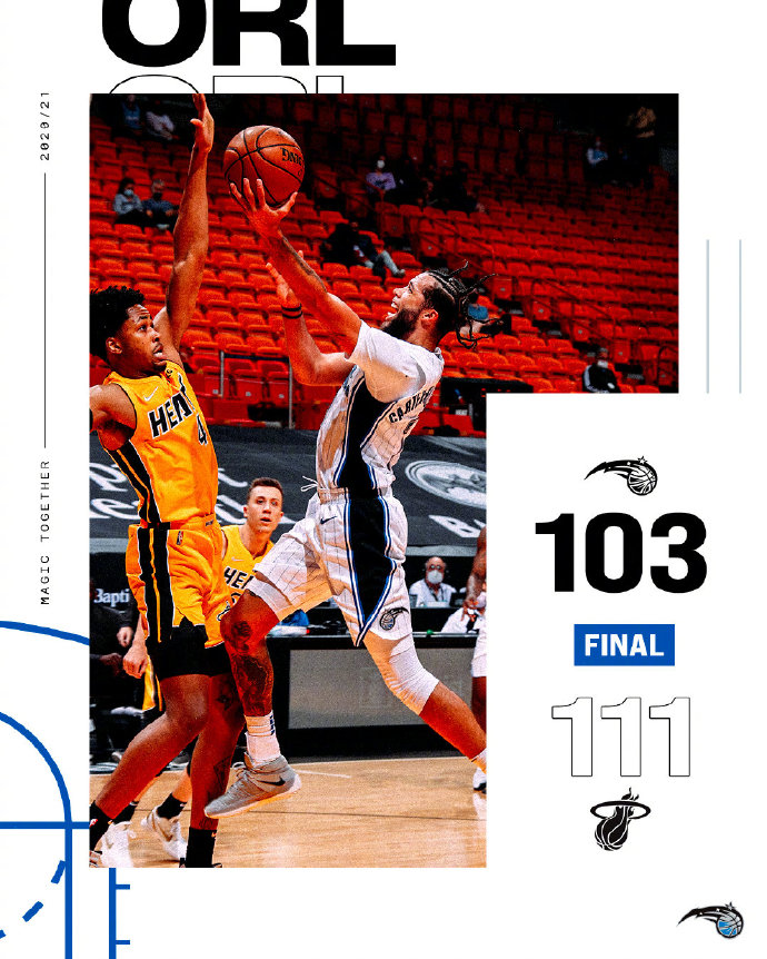 NBA常规赛,全明星假期过后,五连败的魔术奔赴迈阿密客场挑战热火,后者状态正盛,上一场击败鹈鹕取得近十场比赛的第七场胜利,目前位居东部第六。前者上一场惨遭老鹰逆转,遭遇五连败,目前排名东部倒数第二。本场比赛阿德巴约、富尼耶、特伦斯-罗斯因伤缺战,莱昂纳德因为不当言论被禁赛一周,阿隆-戈登则迎来复出。首节缺阵15场后复出的阿隆戈登表现不俗,开局连续得分为球队鼓舞士气。热火13中6的三分球一度为球队取得7分领先,但节末被魔术打出9-0攻击波将比分反超。次节开局,双方命中率都不高,后半段双方开始互飙三分,两队始终保持交替领先的状态,谁也没能拉开分差。凭借半场11记三分的出色手感,热火微微领先结束上半场。易边再战,双方轮流打出高潮,魔术培根突然发力,一人连得8分帮助球队反超比分,随即被热火反打一波6-0。随后双方展开拉锯战,最终以82平进入第四节决战。末节上来,魔术依靠武切维奇在内线的优势和牵制力以及培根的火热手感不停取分,热火则在巴特勒的率领下稳扎稳打始终保持着领先优势,并在最后一分钟将分差拉开到10分,最终魔术客场103-111不敌热火,苦吞六连败。