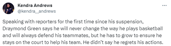 格林还透露他和球队私下谈过,表示:我们所有人的共识是,无论发生什么,我都会成为我自己。这不会改变。但总有更好的方法可以做某事。所以它正在寻找更好的方法。这是我们所有人的共识。