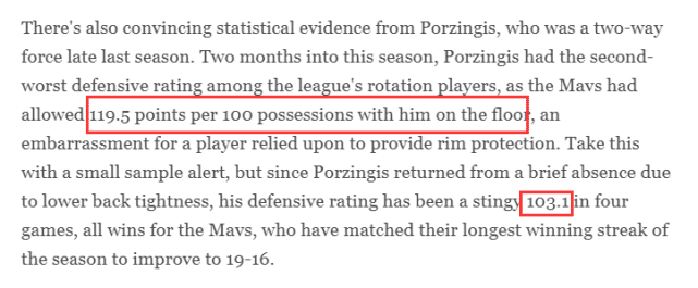 开季前两个月,波尔津吉斯的防守效率是119.5,也就是当他在场时,独行侠百回合失分高达119.5分,这有多差?联盟所有的轮换球员中,排名倒数第二!作为一个能够护筐的大个子,这样的防守数据和排名确实太尴尬!