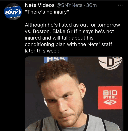 另外格里芬这边有点搞笑了,在采访时表示自己压根没受伤,这就尴尬了!球队说他有伤不能打可能是随便找个借口,想让他跟球队磨合。但现在格里芬完全不给球队面子,相当于主动让联盟调查,无理由不打比赛的话是可能被罚款的,刚到篮网就惹事?