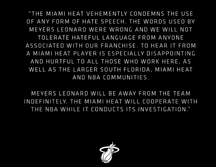 此前,莱昂纳德在自己玩游戏直播的过程中,使用了一些不好的词汇来辱骂别的玩家,这遭到了猛烈的批评。莱昂纳德随后公开致歉,并且表示自己不知道这些词汇的含义。不过很快,游戏赞助商ORIGIN PC取消对莱昂纳德的赞助。而NBA也宣布介入调查,热火方面也将他无限期停赛。值得一提的是,热火老板阿里森就是犹太人。