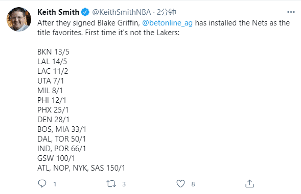 之前湖人一直霸占夺冠赔率榜第一名,如今篮网正式官宣签约格里芬之后,篮网本赛季首次力压湖人升到榜首,湖人则是首次掉到第二,因此篮网暂时成为夺冠最大热门,更是湖人卫冕路上的最大敌人。