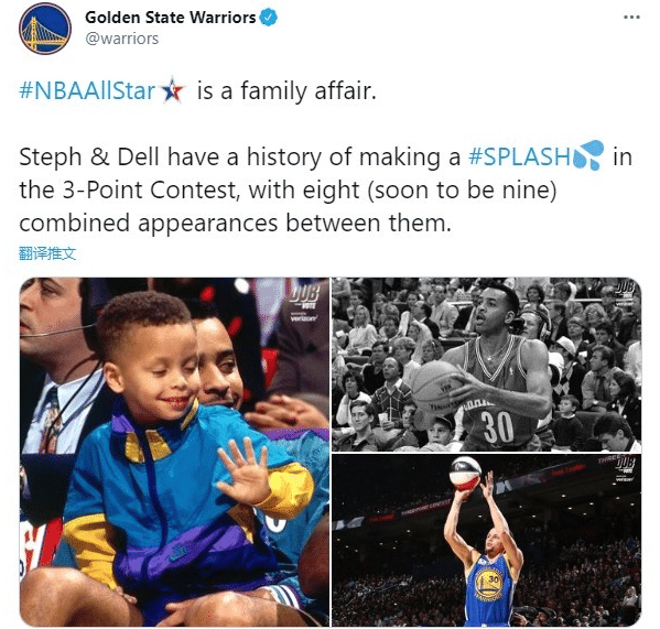 “就在今天,金州勇士队给库里的三分球大赛进行预热,他们的主题是“传承”,图片是库里的爸爸戴尔带着斯蒂芬-库里在场边观看全明星,还有两人一起在三分球大赛中进行投篮的动作对比,同时配文:“这是一个关于家庭的故事,斯蒂芬和戴尔在三分球大赛上有着辉煌的历史,他们一共出场了8次,很快就要9次了。”