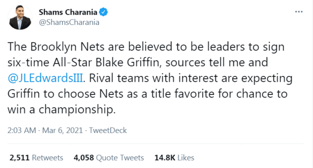 名记查拉尼亚报道称,消息源告知,篮网是签下格里芬的领跑者,对格里芬有兴趣的多支球队认为格里芬会选择篮网,因为篮网是总冠军的有力竞争者。