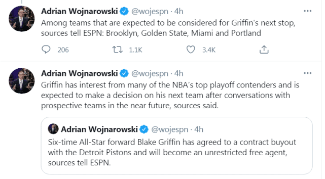 沃纳罗斯基表示,篮网、勇士、热火、开拓者都是格里芬的潜在下家,名记马克-斯坦恩报道称,湖人、快船也在力争签下格里芬。