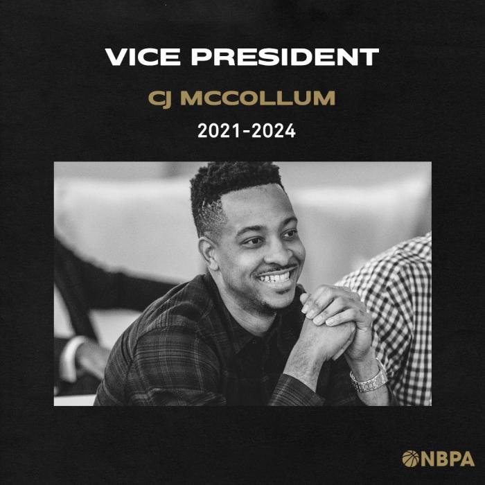 NBPA(球员工会)官方宣布,有球员投票决定,CJ-麦科勒姆再次当选球员工会副主席,从现在开始任期3年(2021-2024年);此前CJ就是球员工会副主席,恭喜他再次当选,目前太阳球星保罗是球员工会主席,伊戈达拉是现任第一副主席。