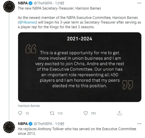 国王核心球员哈里森-巴恩斯成为新的财务部长,NBPA也已经正式官宣,同样任期3年;此前安东尼-托利弗已经担任长达8年的财务部长,如今巴恩斯取而代之。