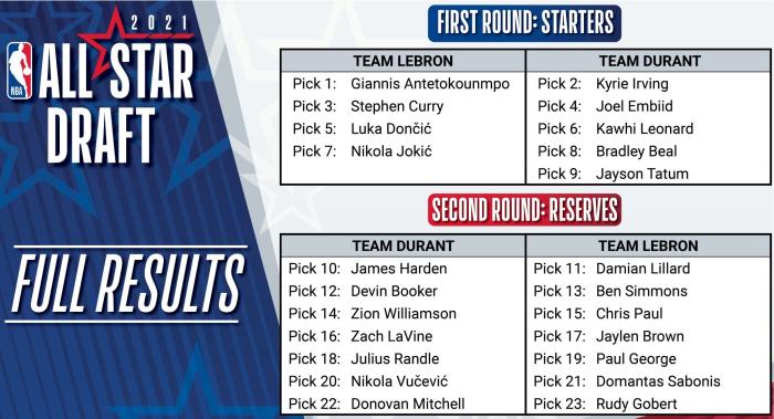 最后附上詹姆斯队和杜兰特队大名单,可惜杜兰特因伤打不了,篮网三巨头无缘同时亮相亚特兰特全明星赛。