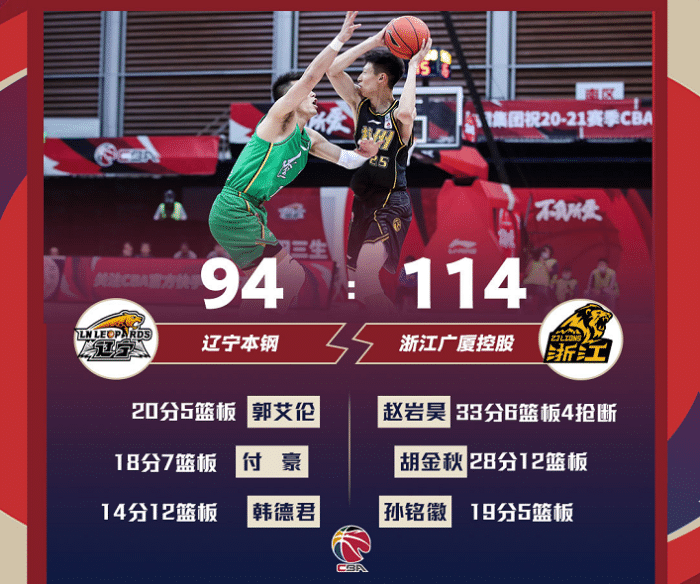 来源:24直播网03-04 19:5524直播网3月4日讯 今天晚上CBA常规赛焦点战辽篮和广厦的强强对话结束了争夺,最终广厦114-94击败辽篮,这场比赛广厦掌握着主动权,他们首节得到38分,单节领先17分,上半场领先19分,分差也一度拉大到20+,虽然下半场辽篮在郭艾伦的带领下将差距缩小到10分,不过广厦的整体气势和状态更好,他们没有给辽篮翻盘的机会,成功拿下了胜利。胡金秋28分12篮板,孙铭徽19分5篮板5助攻4抢断和赵岩昊33分6篮板4抢断是广厦赢球的最大功臣。郭艾伦(20分5篮板)CBA生涯抢断数来到了645次,超越了辽篮主帅杨鸣(644次),升至CBA历史抢断榜第18位。