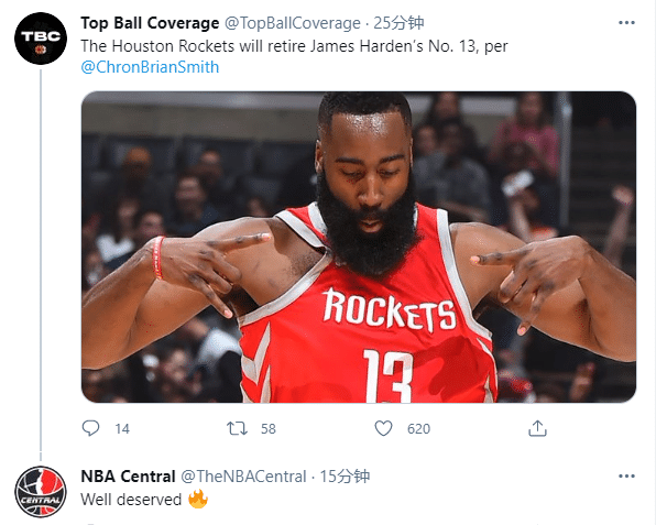 火箭记者费根最先报道,费尔蒂塔明确表态将在未来退役哈登13号球衣,随后众美媒疯狂晒照转发这样的重磅消息,美媒NBA Central发推写道:当之无愧!