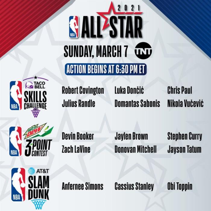 三分大赛参赛者名单:库里、布克、拉文、米切尔、杰伦-布朗和塔图姆,其中库里是职业生涯第7次参加三分大赛,不过库里仅在15年夺得三分大赛冠军;扣篮大赛的参赛者分别是开拓者球员安芬尼-西蒙斯、步行者新秀卡修斯-斯坦利和尼克斯新秀托平,三人争夺扣篮王称号。