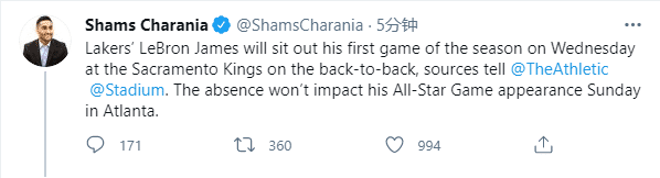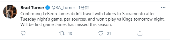随后名记Brad Turner报道,湖人输给太阳赛后,詹姆斯没有随队前往萨克拉门托,他不会在明天对阵国王的比赛中出场,本赛季首次轮休不打。詹姆斯暂时离开球队,接下来湖人对阵国王,就要靠其他队友了。