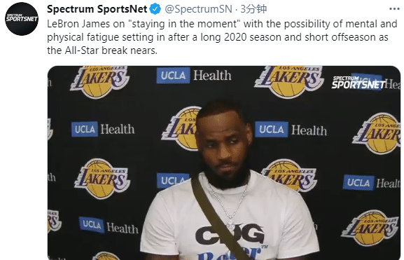 詹姆斯表示:在经历了漫长的2020赛季和短暂的休赛期之后,随着全明星赛的临近,精神和身体都可能出现疲劳的状况,这就是詹姆斯决定轮休的原因;36岁生涯第18个赛季,詹姆斯确实该休息一下了,也许在全明星赛上,我们能看到精力充沛的全力詹。