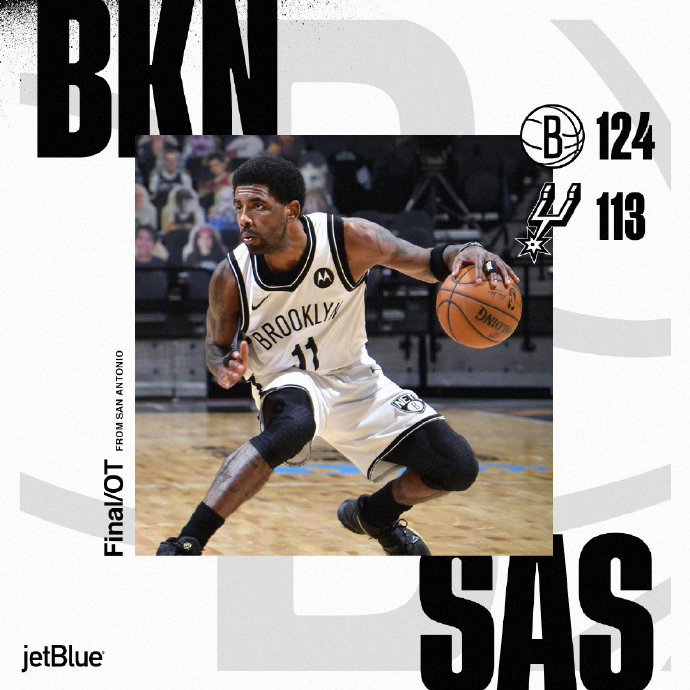NBA常规赛篮网VS马刺。此役欧文复出,杰夫-格林则继续因伤缺席。首节哈登虽然一分未得,但他却送出6次助攻盘活了全队,在他的穿针引线下篮网多点开花,一波8-0的攻势很快便确立了领先优势。次节,马刺依靠突破冲击内线一度追平比分,但靠着哈登的单打以及奇兵克拉克斯顿单节13分的神奇表现,篮网又重新拉开分差,节末马刺下起一波三分雨顽强地将分差缩小至3分。第三节马刺利用对手进攻效率下降的良机,靠着沃克、珀尔特尔、穆雷的反复冲击终于将比分追平,末节哈登开始接管比赛,一波16-3的攻势让马刺瞬间陷入被动,但马刺却在最后时刻三军用命回敬一波16-6将分差缩小至2分,关键时刻穆雷命中压哨绝平球将比赛拖入加时。加时赛,欧文、布朗和哈登连续命中四记三分,马刺没能重演奇迹,最终篮网客场124-113击败马刺。