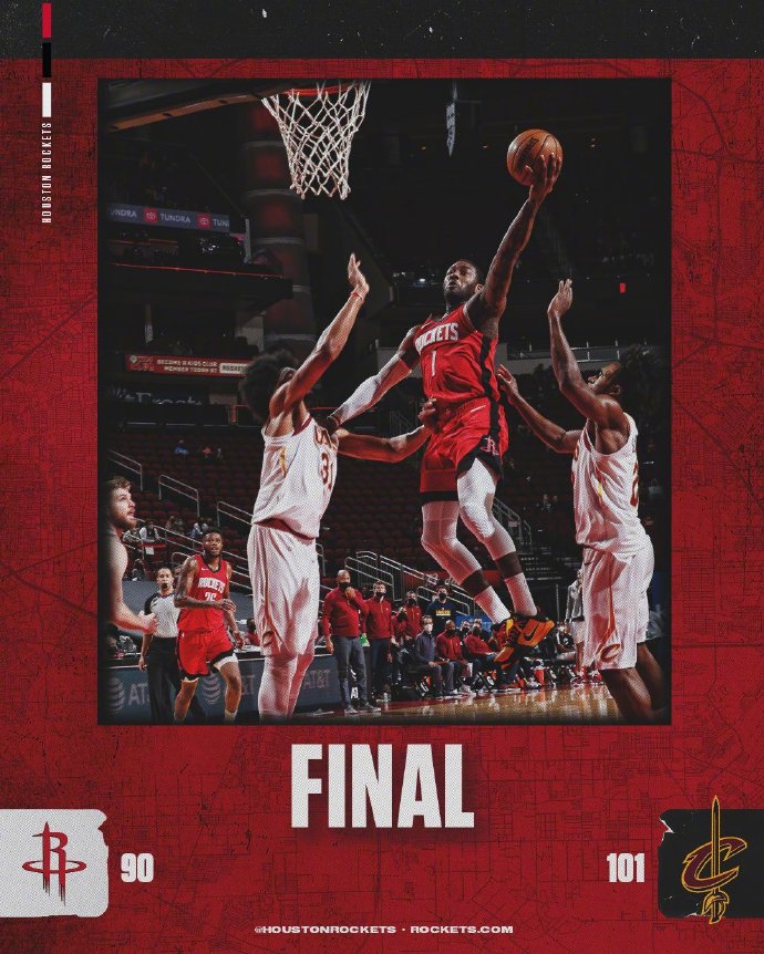 遭遇11连败的火箭今日坐镇主场迎战骑士,火箭昨日刚刚49分惨败灰熊状态降入谷底。骑士则结束10连败并在近期触底反弹迎来3连胜。首节比赛几乎就是沃尔一人单挑骑士整队,火箭单节拿下29分里有17分来自于沃尔,奈何球队防守端问题很大,加之骑士阵容里也有首节便拿下12分的塞克斯顿,骑士依靠更加全面的进攻取得5分领先。次节骑士自己的哑火给了火箭机会,沃尔联手奥拉迪波拿下11分并将分差缩小至1分进入下半场。下半场的火箭几次追上甚至短暂反超比分但都没能守住,末节开局火箭再一次反超比分,但随后他们迅速陷入得分荒,而骑士随后用一波13-0的攻势确立起两位数领先奠定胜局。最终,骑士客场101-90再胜火箭,并送火箭12连败。
