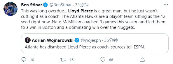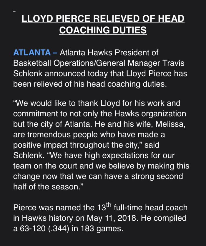 随后老鹰篮球运营总裁兼总经理Travis Schlenk发表了声明,他表示:在此,我们要感谢皮尔斯的工作和他对老鹰以及亚特兰大的贡献。皮尔斯和他的妻子都是了不起的人,他们对这座城市产生了积极的影响。我们对球队的成绩有很高的期望,希望能通过现在的改变来让球队在下半程获得更好的战绩。