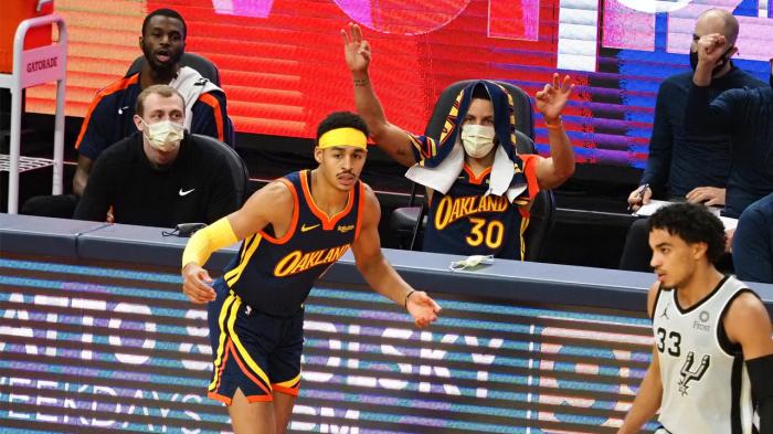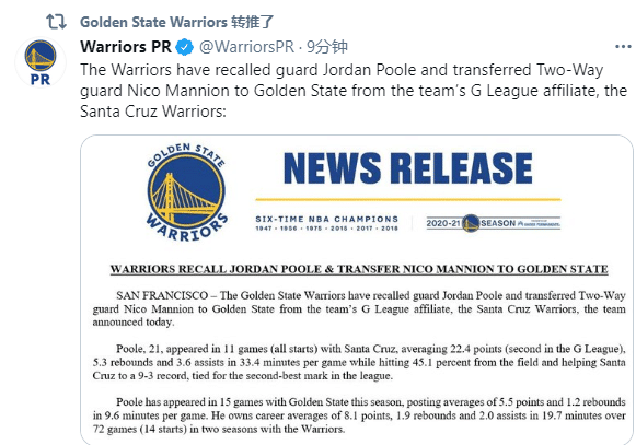来源:24直播网03-02 10:2224直播网3月2日讯 北京时间3月2日,勇士官宣,正式从发展联盟召回乔丹-普尔和尼克-曼尼恩,此前勇士把他俩下放到G联盟附属球队圣克鲁兹勇士,只要未来几天他们的新冠检查没问题,他们将在下一场勇士对阵开拓者比赛中复出,终于重返NBA了。