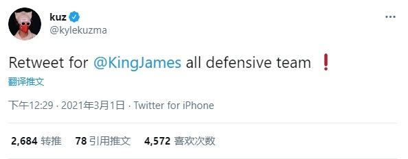贡献12分11板1助的库兹马赛后兴奋发推“支持詹姆斯进最佳防守阵容的请转推!”本赛季的库兹马尽管数据进步不大(甚至有下滑)但整体效率以及在防守、传球方面的确有进步,作为冠军球队的角色球员绝对够用了,用老詹的话来说就是“他更清楚自己的位置了”