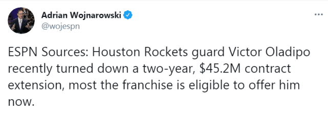 奥拉迪波目前在4年8500万合同的最后一年,火箭必须在3月25日交易截止日前做出选择,到底要不要留下这位全明星后卫。他们可以选择和他续约,也可以选择聆听其他球队的报价,把他交易走。之前,火箭在涉及哈登的一笔多方交易中,从步行者得到了奥拉迪波。