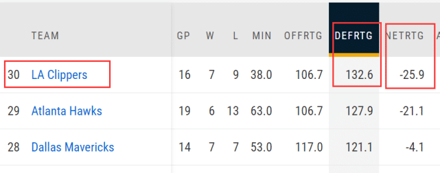 所谓关键时刻,是指比赛最后5分钟分差在5分以内的时段。快船关键时刻的防守效率仅为132.6,也就是百回合失132.6分,排在联盟第30位,关键时刻百回合输给对手25.9分,同样排在联盟第30位两大关键时刻的数据都是倒数第一,快船打硬仗的能力遭到质疑。