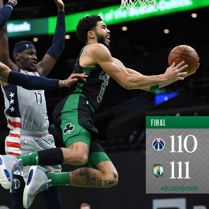 北京时间3月1日讯 NBA常规赛,凯尔特人坐镇主场迎战奇才,前者上一场击败了步行者结束连败,后者则正在经历两连胜,此役布朗因伤缺阵。首节开局凯尔特人一波7-0取得领先,奇才通过造杀伤在罚球线缩小分差,塔图姆和贝尔坦斯互相回应三分球,两队陷入拉锯战,次节塔图姆延续良好手感,奇才则由比尔连续打中紧咬比分,半场凯尔特人60-55领先五分。下半场风云突变,绿军打成一波小高潮拉大分差,随后进攻效率下降,奇才不断蚕食分差,三节结束时追到只差三分,末节绿军进攻依然不理想,奇才众人发力很快获得反超,这时泰斯站出来连得八分稳住局面,随后双方进入球星对飙,比尔连续打中帮助奇才扩大分差,凯尔特人稳扎稳打迫近比分,还是比尔站出来连传带攻使奇才占据主动,塔图姆两记突破后又造成比尔失误,杀进禁区再中获得反超,比尔绝杀不中,凯尔特人111-110险胜奇才。