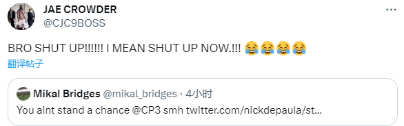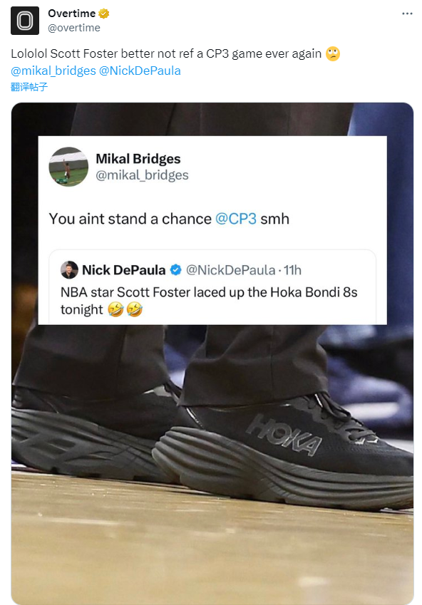 美媒晒出福斯特穿着名贵跑鞋吹罚比赛,保罗前队友大桥发推调侃:保罗,你一点机会都没有;克劳德回复大桥:兄弟,闭嘴,我的意思是现在就闭嘴。
