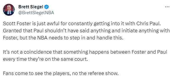 美记Brett Siegel表示:福斯特总是和保罗纠缠不清,真是太糟糕了。诚然,保罗不应该对福斯特说任何话,也不应该发起任何争执,但NBA需要介入处理此次吹罚。福斯特每次吹保罗的比赛都会发生一些事,这并不是巧合。球迷是来看球员的,不是来看裁判表演的。