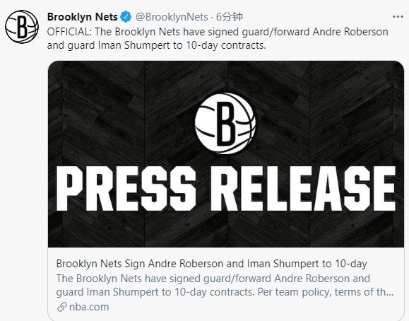 官宣!篮网正式重签两大悍将,仅花31万便签回罗伯森和香波特