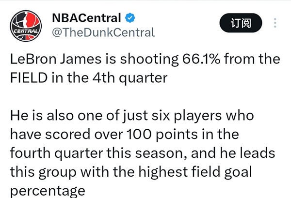 另外,詹姆斯还是赛季至今仅有的6名第四节总得分超过100分的球员,詹姆斯的第四节命中率高达66.1%,是这6名球员中最高的。