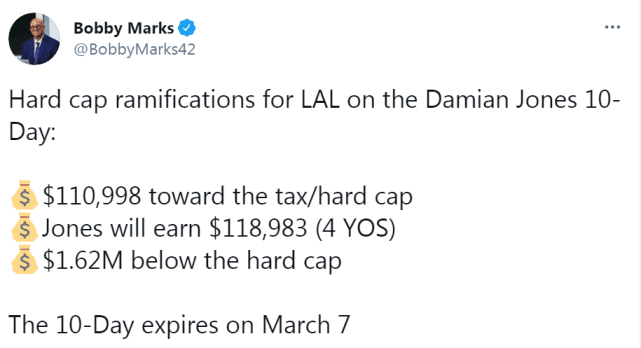 薪金专家鲍比-马克斯表示,琼斯将通过这份合同得到118983美元的薪水。这份合同将在当地时间3月7日到期,届时湖人将决定是否和他续签第二份短合同或者直接续约到赛季结束。