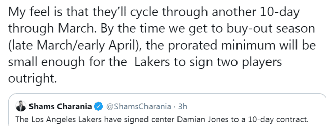 湖人裁掉库克后,常规阵容人数减少至13人,根据联盟规定,他们必须在两周之内签下一名球员,让阵容人数重新达到14人的最低标准。湖人没有等太久,佩林卡宣布他们和琼斯签下一份10天短合同。