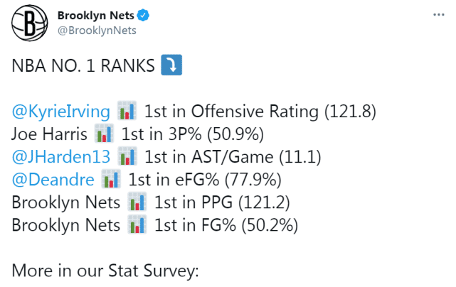篮网九大数据排名榜首!欧文进攻效率联盟第一,球迷:继续提升防守