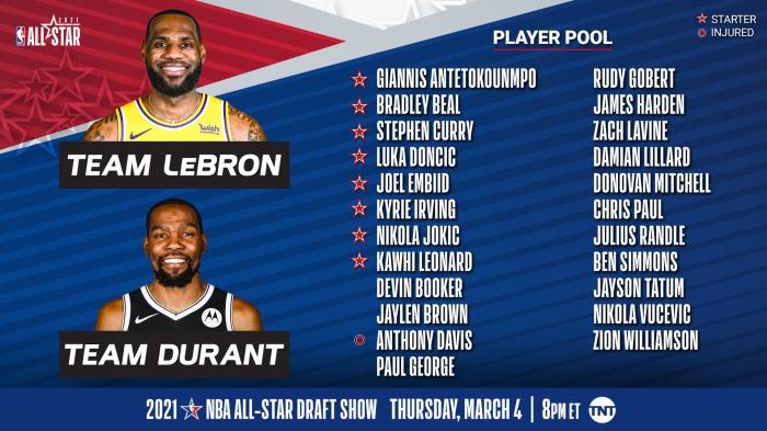 东部全明星阵容大名单是——塔图姆(杜兰特因伤缺席、)恩比德、字母哥、比尔、欧文、哈登、西蒙斯、兰德尔、拉文、杰伦-布朗、小萨博尼斯和武切维奇;目前还有一个悬念,暂不清楚杜兰特是否会以队长的身份参加直播选人。