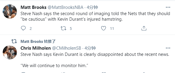 对于这样的消息,篮网主帅纳什透露,杜兰特对此十分失望,但要不是这样,情况可能会更糟,第二次的核磁结果更清晰,篮网需要保持谨慎。