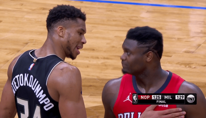 锡安34分多次挨帽字母哥38+10罚球终结,赛后两人拥抱+互换球衣